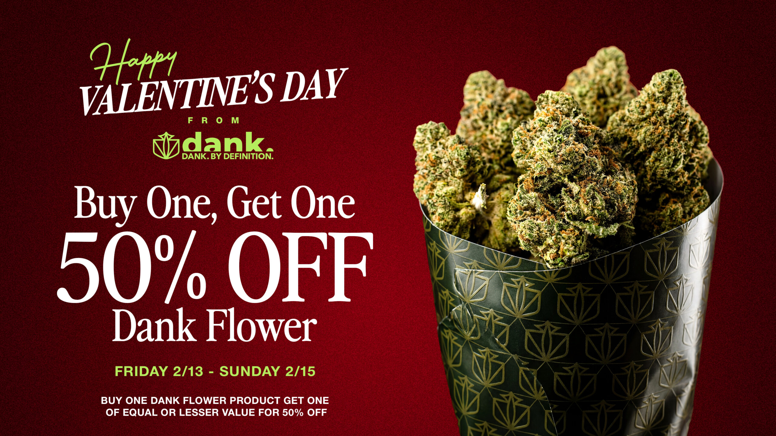 Celebrate Valentine’s Day with a deal that hits the spot. Buy one item from our “Dank Flower” category and get a second of equal or lesser value for half price.